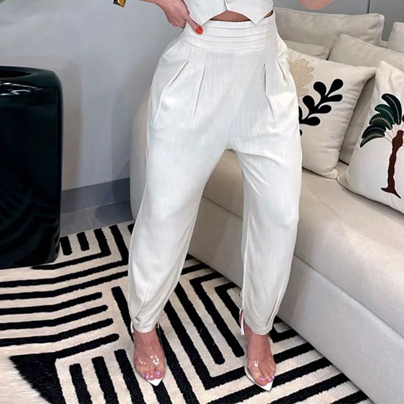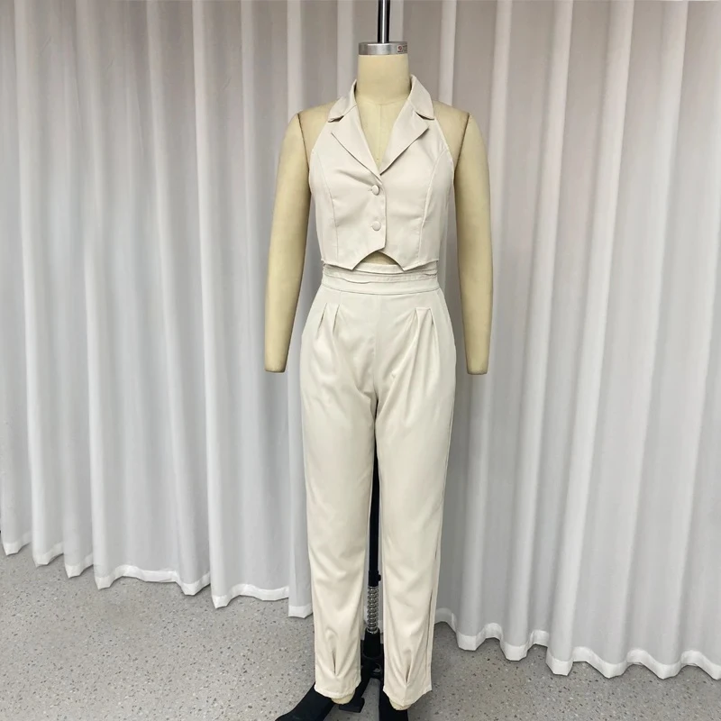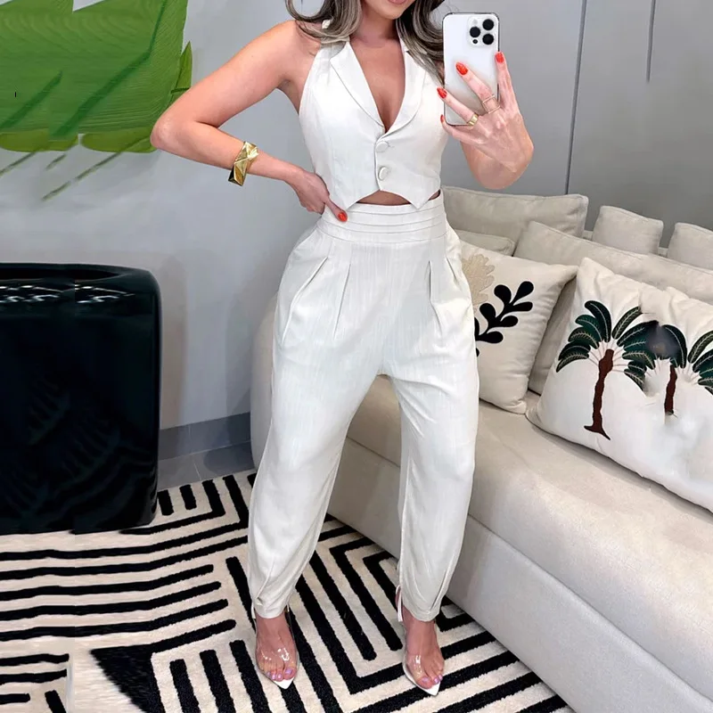 2024 Office Trending Solid Sleeveless V Neck Lapel Single Breasted Button Jacket Top Loose Pants Set Women Two Piece Set